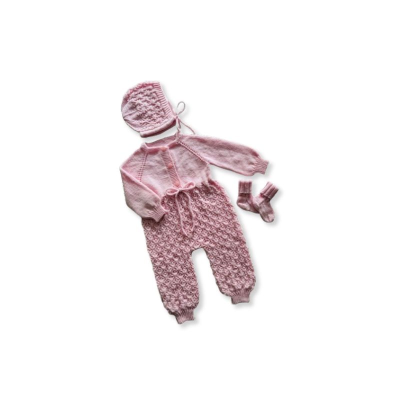 Alma hentesæt er en del af et sæt, hvor der også findes en cardigan, hue og vanter i samme serie, for at kunne fuldende et helt sæt. Opskriften indeholder et udførligt mønsterdiagram.