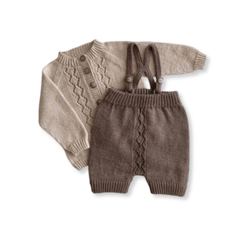 Elliot cardigan og seleshorts er et fint sæt, til den lille dreng, her til forår/sommer. Det er strikket i en sommergarn, som består af bomuld og uld. Cardigan er strikket nedefra og op. Ærmerne tilsættes bærestykket, og er strikket i rag-lan facon, som der giver en perfekt pasform. Seleshortsene er strikket oppefra og ned. Selerne strikkes på til sidst og de er justerbare med en lille knap. Opskriften indeholder et udførligt mønsterdiagram.