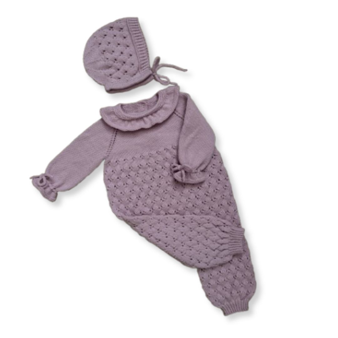 Perle-heldragt og kyse er en del af et sæt, som også inkluderer en cardigan og bloomers i samme serie, for at kunne fuldende et helt sæt. Heldragten er strikket oppefra og ned med stolpelukning midt bag til lukning. Nederst på fronten og bagstykket strikkes et fint hulmønster, og ærmerne afsluttes med bindebånd. Der samles masker op i halsen til den fine krave, som der strikkes frem og tilbage på pinden. Kysen prydes af det samme mønster. Der er isat et bindebånd nederst på kysen. Opskriften indeholder et detaljeret mønsterdiagram.